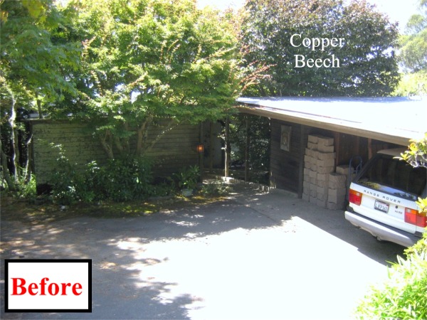 Photo 1 - above - is looking WNW towards the entry & carport from the driveway. Note the height of the Copper Beech above the carport roof. The Copper Beech & trees to left prevented any view of the roof area of the lower west wing. The "sight line" over the Copper Beech can be seen on the Ventilation page.
