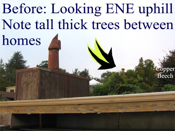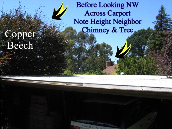 Photo 2 - below - is looking NW across the carport roof level. Note the height of the chimney on the brown house to the north. That chimney is the exact height of the roof access structure that the ZAB denied in Revision 5. The chimney is at the maximum allowable height for the neighbor's lot, while on our property, Plan 5 was 3.5' below the maximum allowable building height, and Plan 6 is some 10' below maximum for our lot. The height of the Copper Beech above the previous roof is clearly visible.