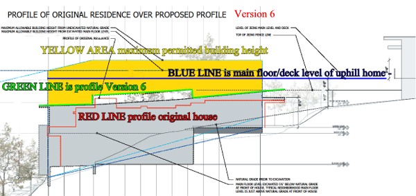 A PROFILE view of the proposed home, looking north. Note the YELLOW area is the maximum building height allowed by City code. Our plan reduces the profile - in green - to nearly identical to the original home - in red. We are well below allowed building height. It should be noted the two most vocal appeallants have constructed their homes, one to maximum height, and the other to above maximum. Our plans meet and/or exceed (in a good way) all of the City building codes.
